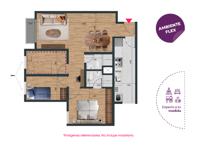 2 Dormitorios + Ambiente Flex | 1 Cuarto de servicio | 3 Baños